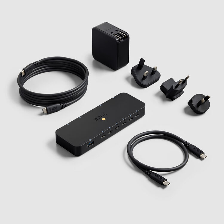 Expand your laptop's data and power capabilities when travelling with this 7-Port Multi-Adapter Hub with Charging and SD Slots from RODE. It connects to your laptop via an included USB-C host cable and 100W adapter. This combo delivers passthrough charging power to your laptop and devices connected to the six USB-C 3.2 Gen 2 ports and single USB-A port. Three included plug adapters provide international power compatibility. A dedicated USB-C port for an optional monitor makes working easier when using a larger display. Lastly, the hub has both microSD and SD card slots that allow easy backup of memory cards without the need to connect each device via cable.
